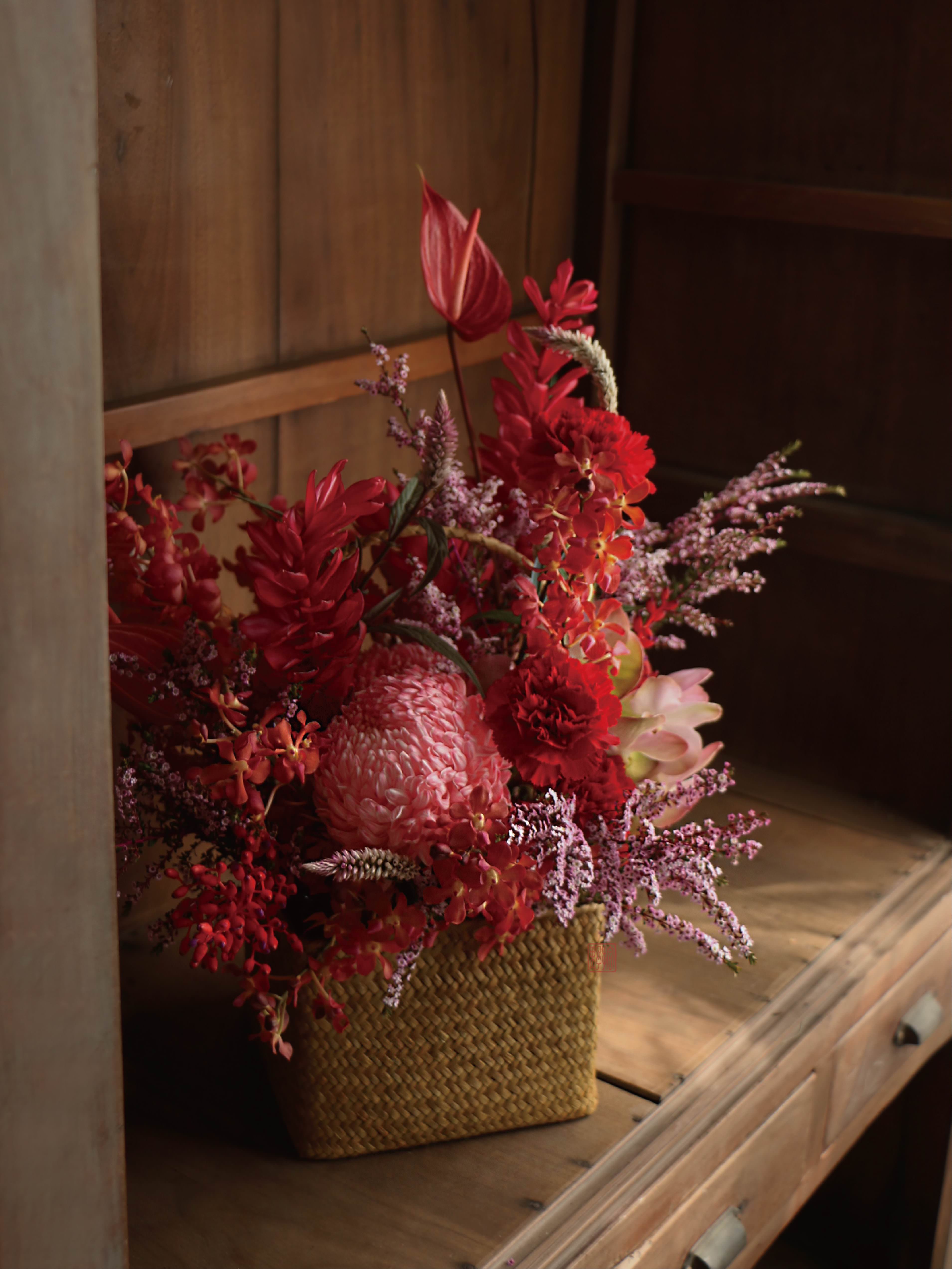 牡丹菊又稱富貴菊,是新春應景的年節花卉。手工編織的提籃,加上觀賞期長的鮮花製作,在除舊布新的同時,擺上新春最開運的色彩,讓你新的一年紅運當頭,紅紅火火一整年。