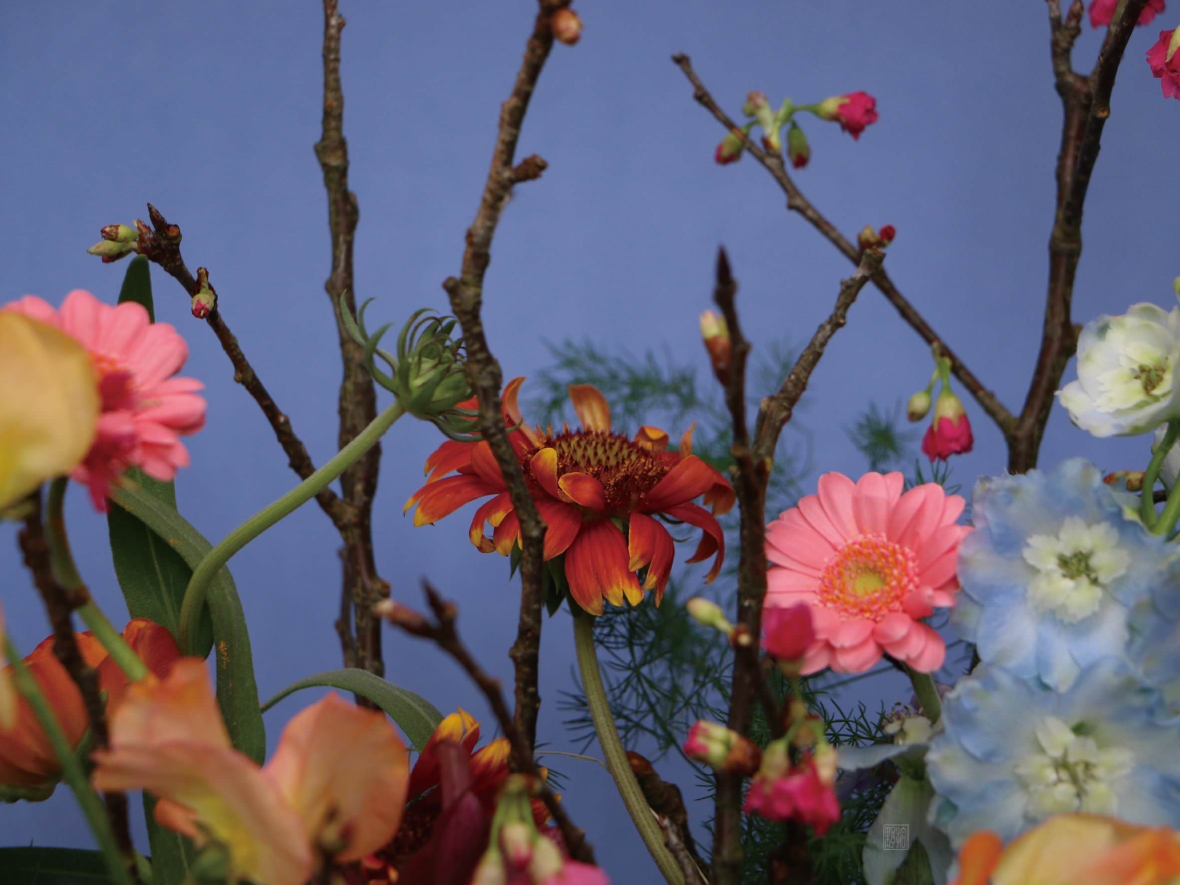 內容|花藝的基底是是架構,此次透過櫻花枝與拉菲草當作基本架構去固定較細軟的花材,與不同花種色系的互動,體現春意盎然之意象。
