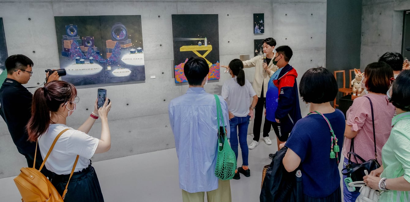 從過去的《潘洛斯之山》與《尖塔》系列,再到2022-2023年最新創作《小劇場》系列,林佳賢畫作所傳遞出的溫度感,都像是黝黯裡兀自熠熠攝人的微小光芒,柔和、暖亮,點亮黑幕上的一片夜空,也守護著漫無止盡的黑夜,讓夢持續在宇宙中無限滋長。