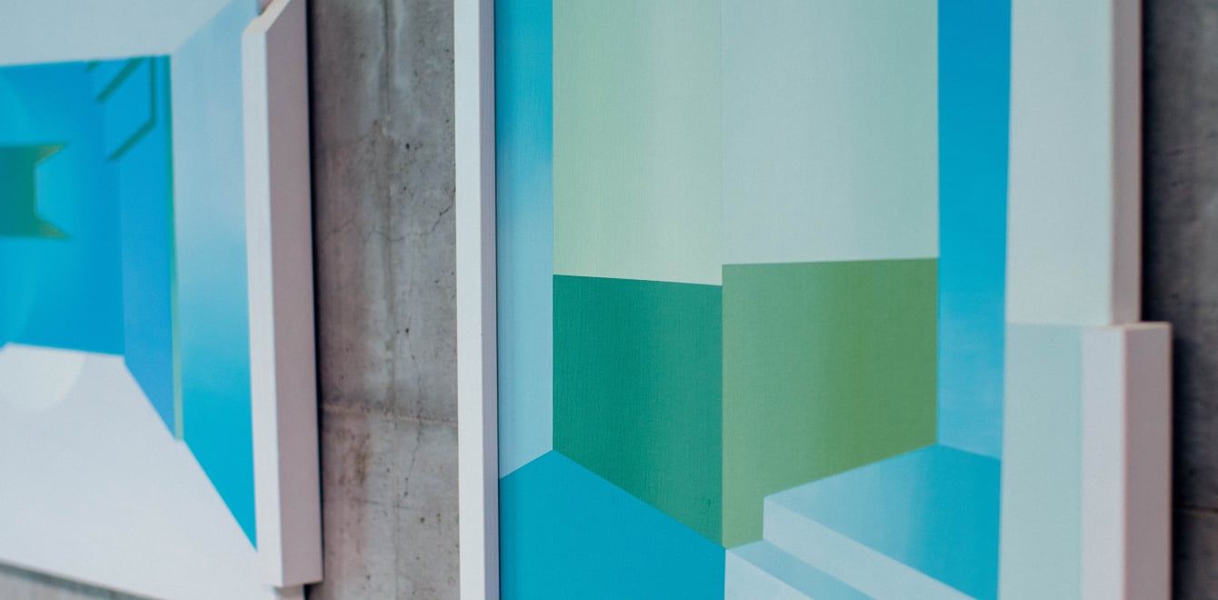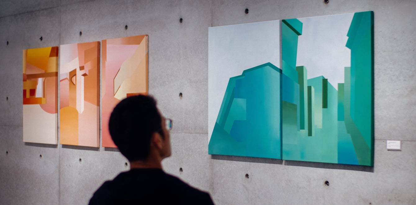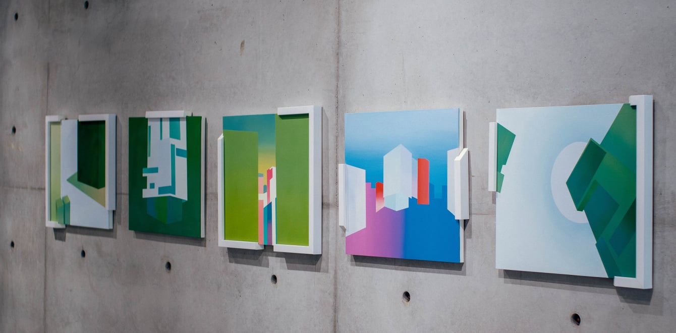 《無機市City Nude》趙馥樂藉由筆觸肌理平坦的壓克力顏料、均值化的顏色調配、具穿透性張力的幾何色塊,抹除龐雜視覺信息所產生的噪音,以從小長大的中永和地區住宅、學校為創作主體,穿插一些遠方去拼貼,揭示出城市的「裸體」狀態。