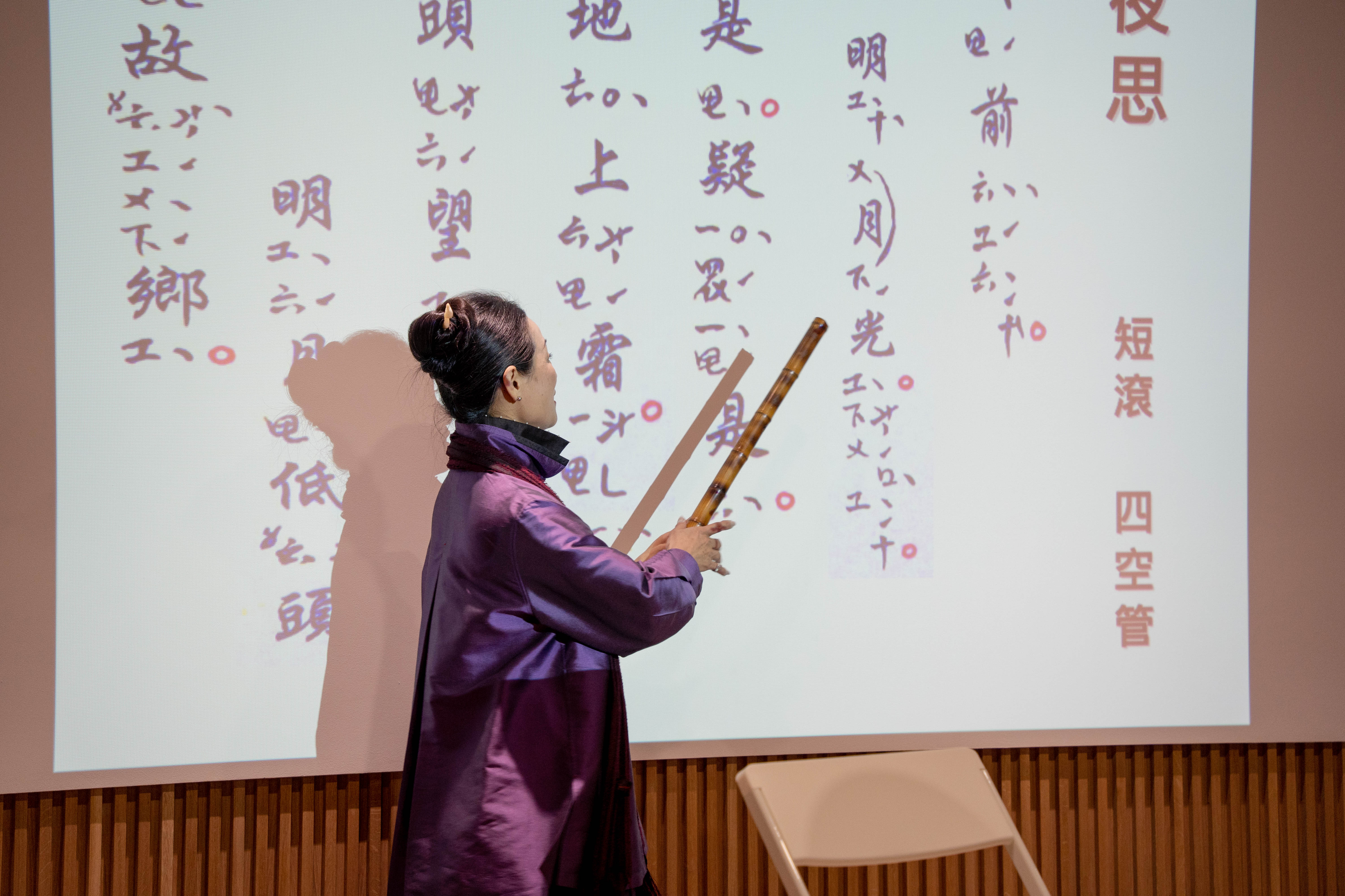 樂器介紹和示範後,老師以《梅花操》《靜夜思》的南管工尺譜為例,說明譜例、音名與調式並帶領大家學習看譜,體驗南管唱腔。