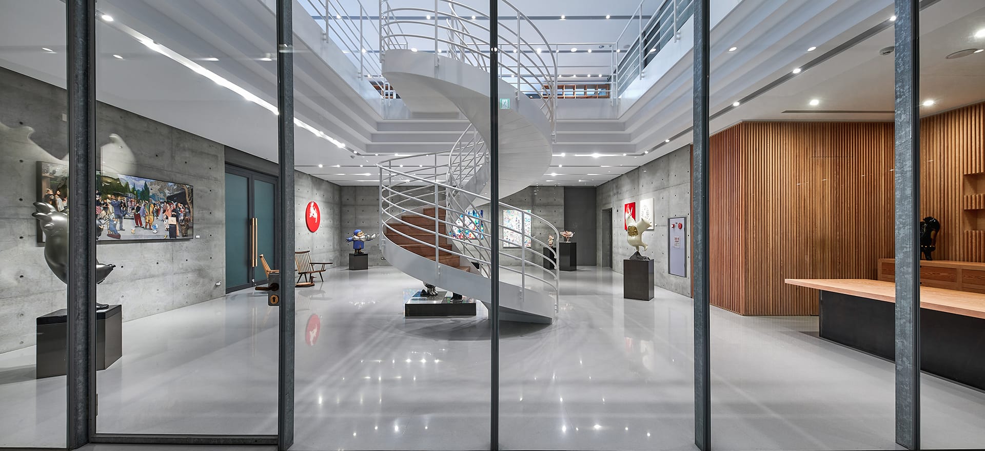 不定時更新收藏作品以及當期展覽藝術品。採用旋轉樓梯為主軸設計,打造大氣優雅的美學當代空間。